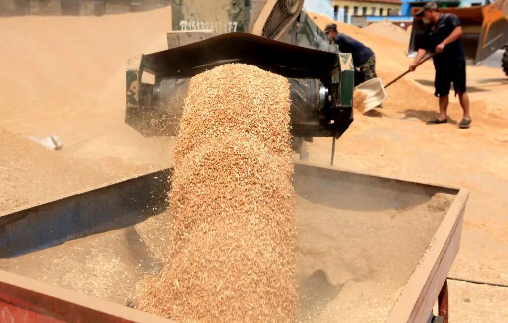 2025年6月14日,在山东省临沂市平邑县一粮食收储企业,传输带向仓库运送夏粮。新华社发(武纪全 摄)