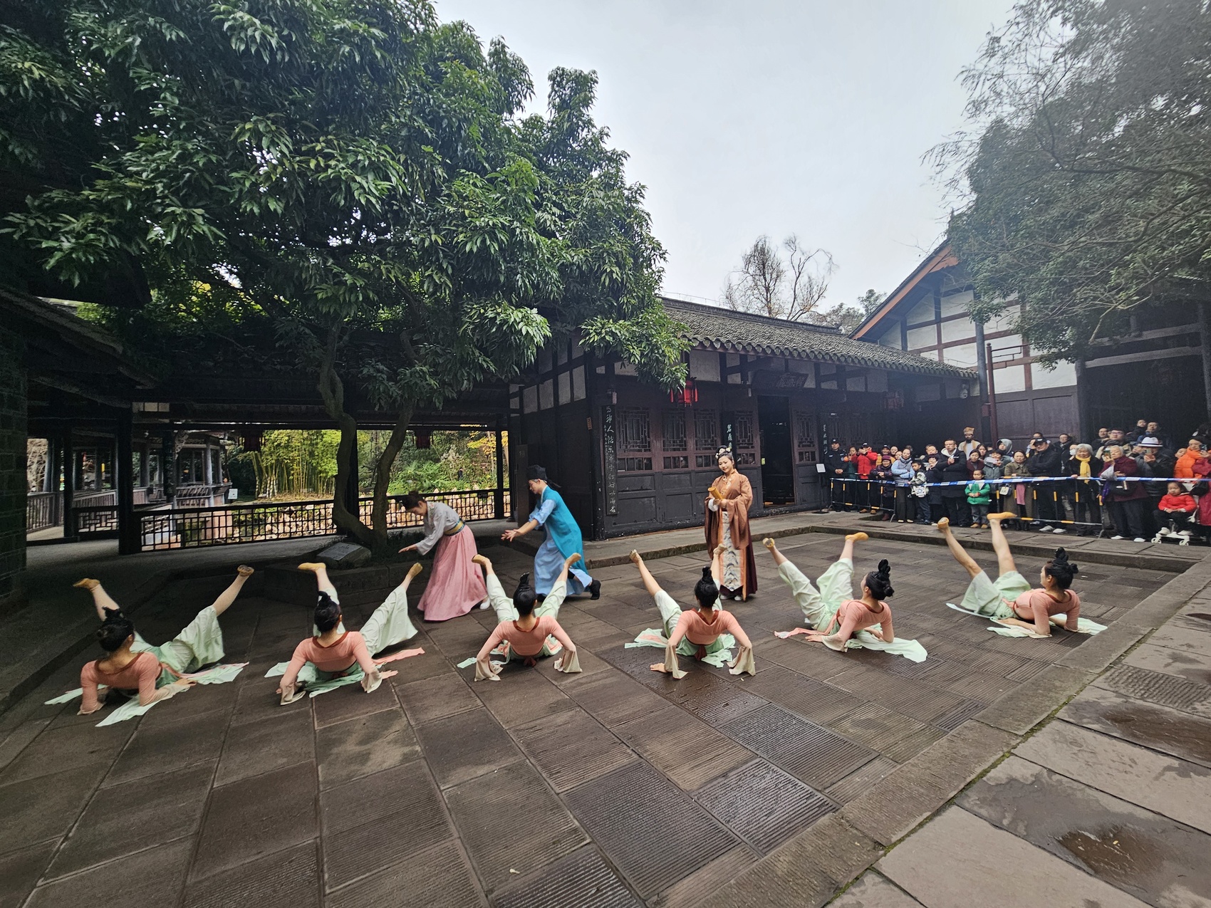 活动期间,不少游客身着典雅汉服漫步园中,衣袂飘飘的身影与古色古香的建筑、精彩的实景剧目相得益彰,为三苏祠增添了更多传统韵味,也成为元旦假期里一道独特的风景线。