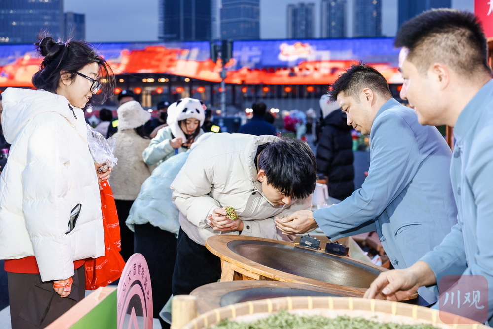 一旁的蒙山茶传统制作技艺展示区和蒙顶山茶产品展销区更是人来人往,热闹非凡。琳琅满目的文创及茶叶产品一应俱全,工作人员热情地向过往市民介绍产品特色:“您看这款蒙顶甘露,外形扁平挺直,嫩绿油润,泡上一杯,茶汤清澈明亮,滋味鲜爽回甘,那股悠长的茶香能在舌尖萦绕许久。”