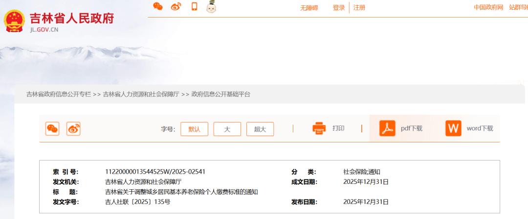 2025年12月31日,吉林省人民政府网站发布《吉林省关于调整城乡居民基本养老保险个人缴费标准的通知》。具体如下: