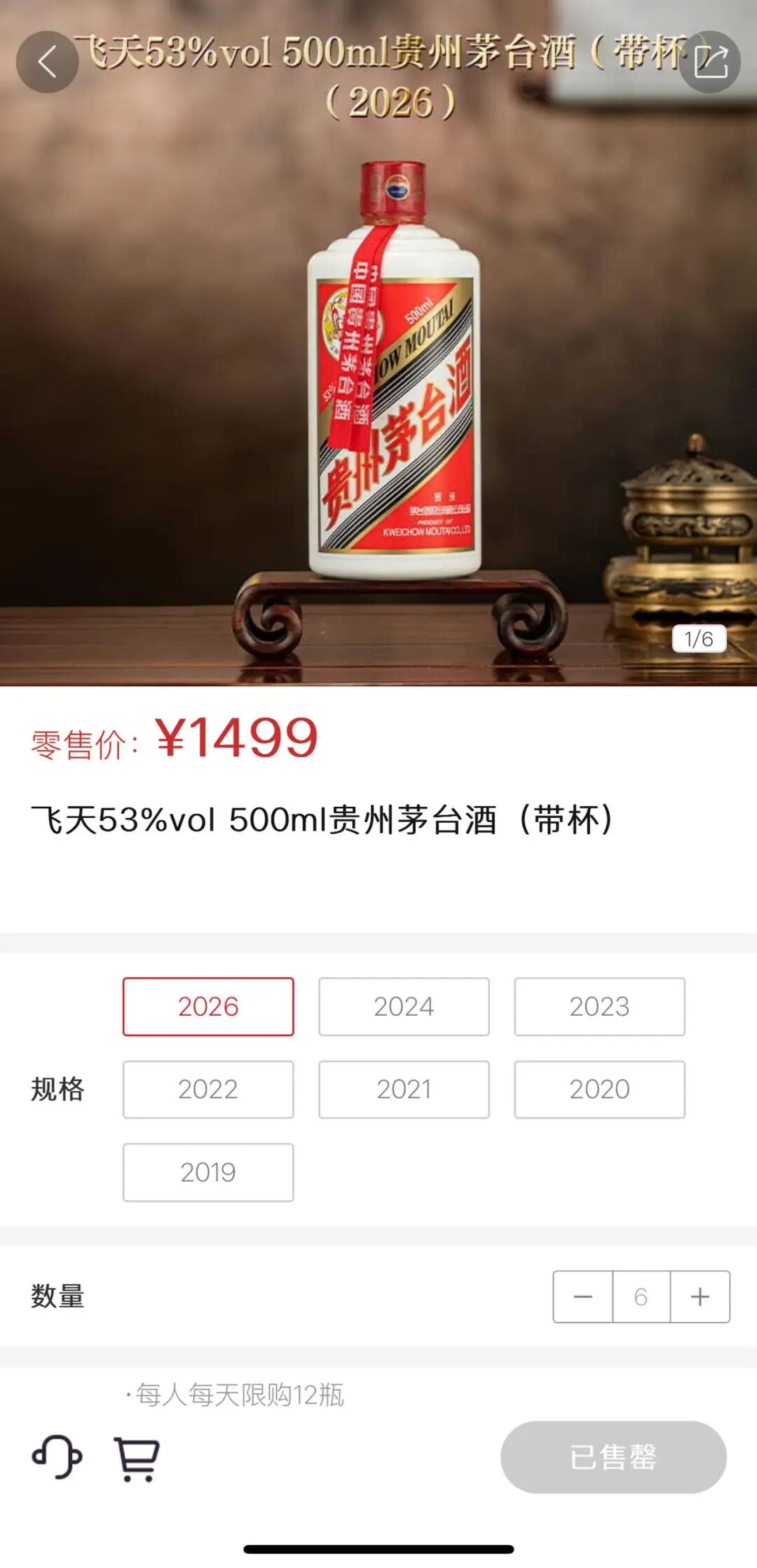 2025年12月31日,贵州茅台通过“i茅台”平台宣布,自2026年1月1日起,53度500ml飞天茅台将以1499元的官方指导价正式上线销售。每日上午9点开售,每人每日限购12瓶。