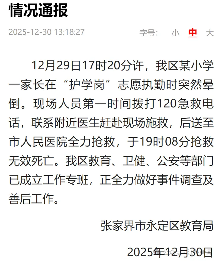 湖南张家界市永定区教育局12月30日下午发布通报,12月29日17时20分许,该区某小学一家长在“护学岗”志愿执勤时突然晕倒。现场人员第一时间拨打120急救电话,联系附近医生赶赴现场施救,后送至市人民医院全力抢救,于19时08分抢救无效死亡。永定区教育、卫健、公安等部门已成立工作专班,正全力做好事件调查及善后工作。