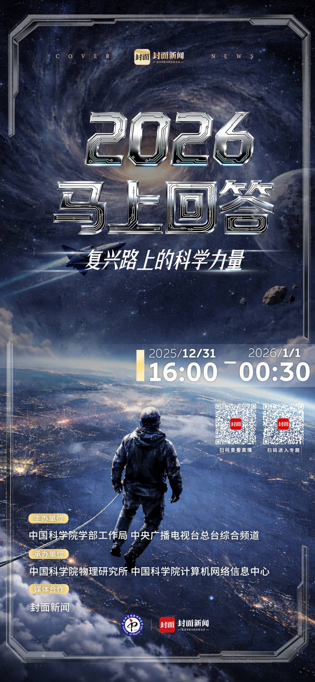 2025年12月31日,“复兴路上的科学力量”中国科学院2026跨年科学演讲重磅开启。封面新闻联合中国科学院物理所全程8.5小时直播,获得超过150万次点击。