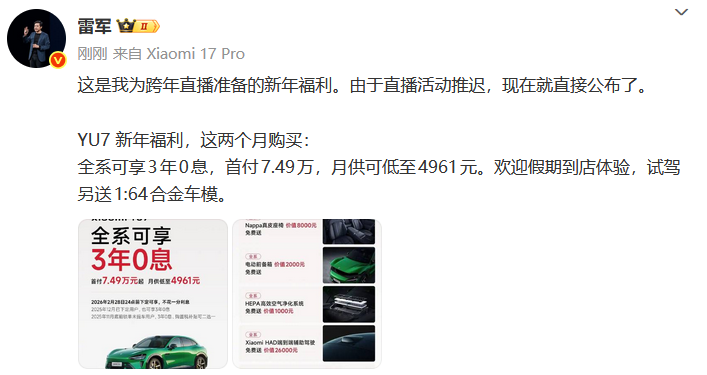 2026年1月1日,雷军发文宣布小米YU7全系推出3年0息购车活动: