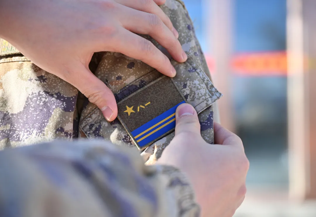 军旗臂章上半部保持解放军军旗旗面基本式样,下半部为深空蓝镶嵌金黄色条,象征进军浩瀚太空。