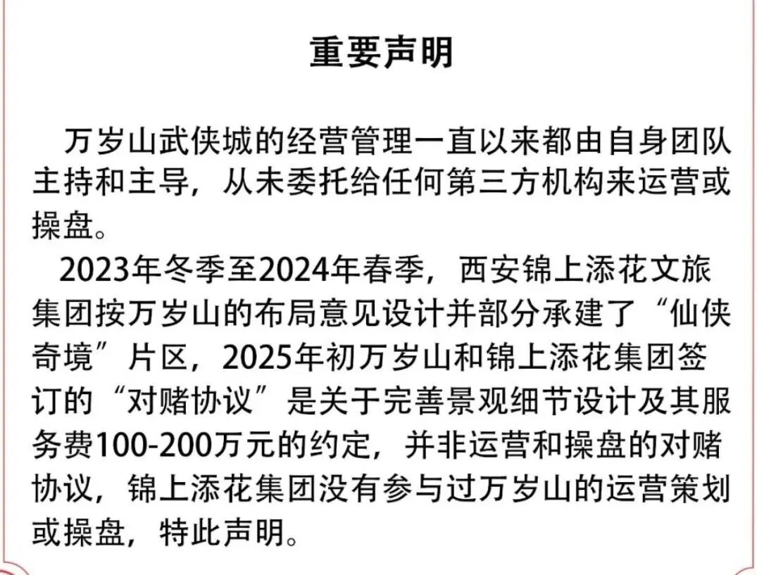 2023年冬季至2024年春季,西安锦上添花文旅集团按万岁山的布局意见设计并部分承建了“仙侠奇境”片区,2025年初万岁山和锦上添花集团签订的“对赌协议”是关于完善景观细节设计及其服务费100万元-200万元的约定,并非运营和操盘的对赌协议,锦上添花集团没有参与过万岁山的运营策划或操盘,特此声明。