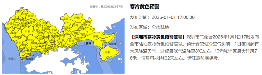 深圳市气象台2026年1月1日17时发布全市陆地寒冷黄色预警信号。预计受较强冷空气影响,1月1日夜间起有大风降温天气,过程最低气温降至8℃左右,沿海和海区最大阵风7—8级,信号可能持续2天左右。请注意防寒保暖。
