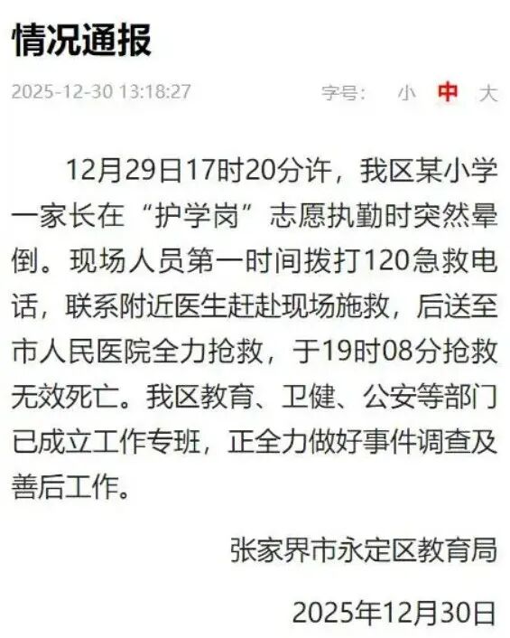 据极目新闻此前报道,12月29日下午,在张家界永定区一所小学门口,一位家长在站护学岗时突然晕倒,送医后身亡。30日上午,事发小学的工作人员告诉记者,出事的家长年仅45岁,孩子读三年级,学校及相关部门正在处理此事。