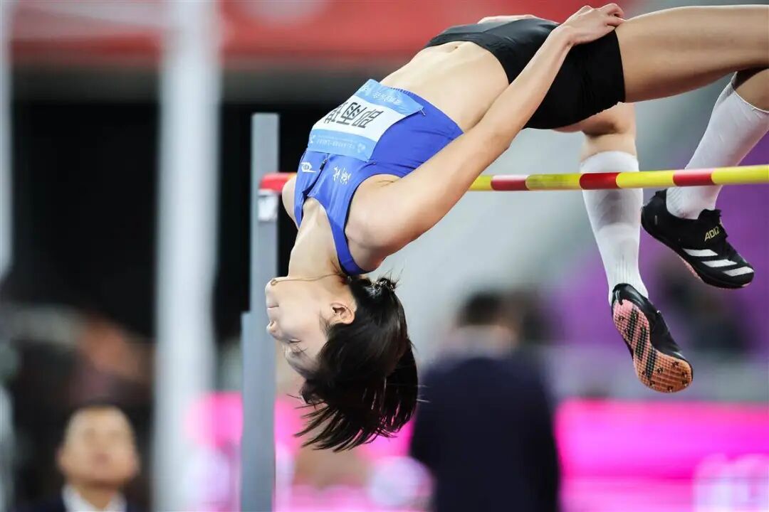 11月19日,第十五届全国运动会田径项目女子跳高决赛在广东奥林匹克体育中心举行。湖北队选手邵雨琪发挥出色,最终跳出1米90的成绩夺得冠军。(湖北日报全媒记者 时龚 摄)