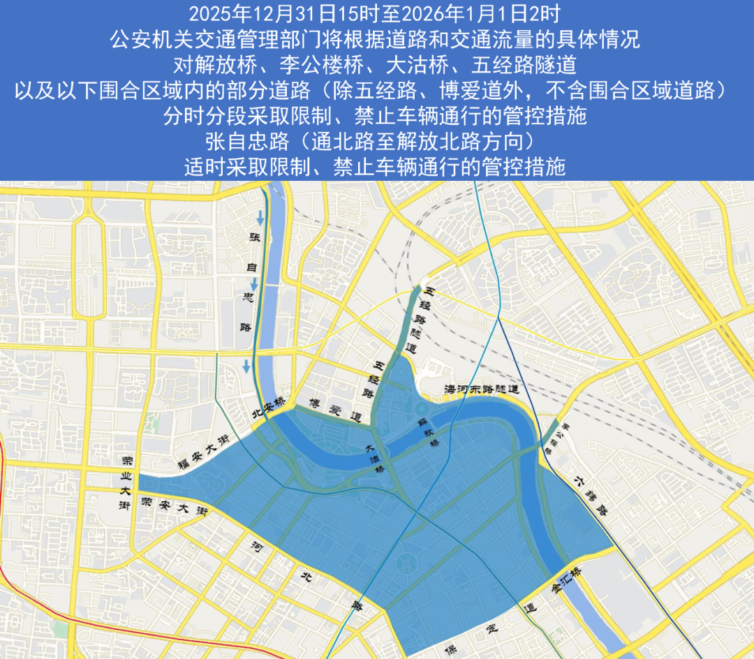 日前,天津市公安局交通管理局发布了《关于跨年夜期间实施部分区域临时交通管控措施的公告》,2025年12月31日15时至2026年1月1日2时,在“一个围合区域、一个核心区域、一条道路、一处落客区”采取4项重点交通管控措施需注意。