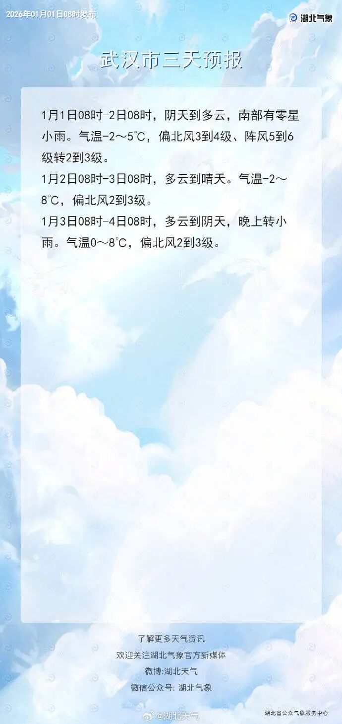 据湖北省气象局1月1日消息,今天全省将由阴天转为多云,仅鄂西南和鄂东南会有零星小雨雪飘落;