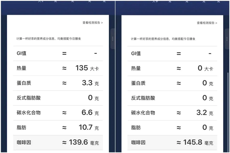 某茶饮品牌部分茶饮产品中的咖啡因含量(左图为一款原叶奶茶,右图为一款原叶果茶)