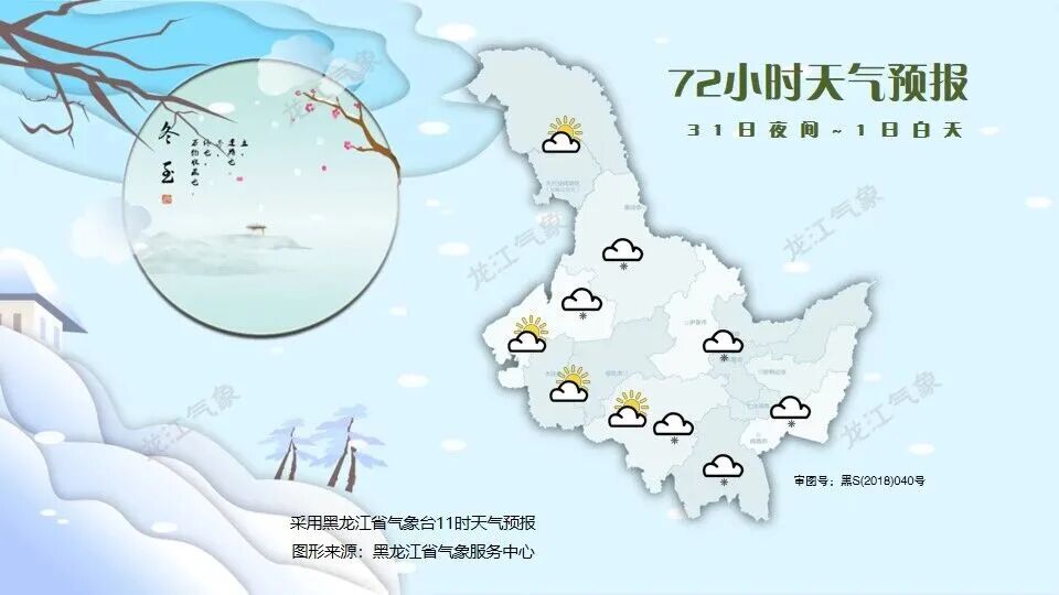 31日夜间到1日白天:黑河、伊春、齐齐哈尔北部、哈尔滨东部、鹤岗、佳木斯、双鸭山、七台河、鸡西、牡丹江多云有阵雪,其他地区晴有时多云。