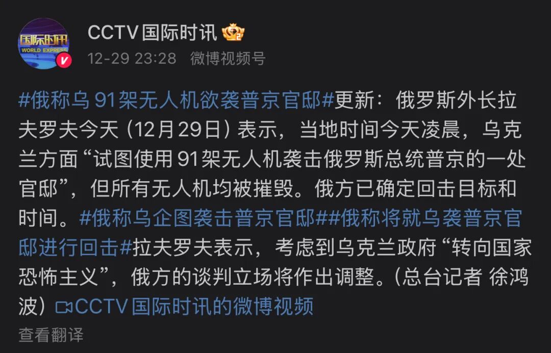 此前,俄罗斯外长拉夫罗夫表示,28日深夜至29日凌晨,乌克兰对位于俄西北部诺夫哥罗德州的俄总统官邸发动无人机袭击。来袭无人机已被俄防空火力摧毁,俄方已确定回击目标和时间。