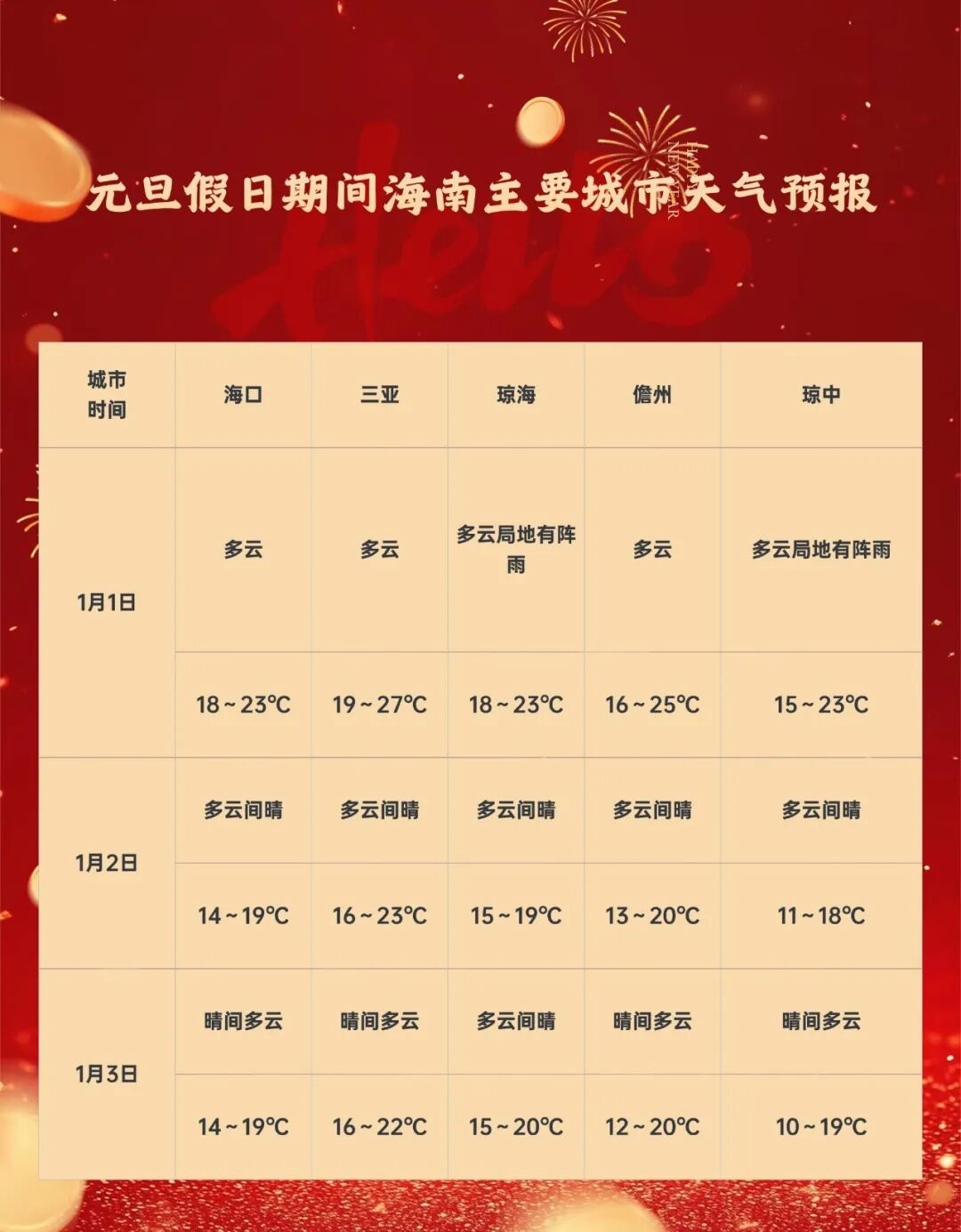 陆地方面:2026年1月1日,海南岛以多云天气为主,中部和东部局地有阵雨;最高气温全岛大部分地区23~27℃,最低气温中部和西部山区14~16℃,其余地区17~19℃。2日~3日,受较强冷空气影响,海南岛以多云间晴天气为主;各地气温明显下降,最高气温五指山以北地区可将至18~20℃,五指山以南地区21~24℃,最低气温中部和西部山区8~11℃,其余地区12~16℃。