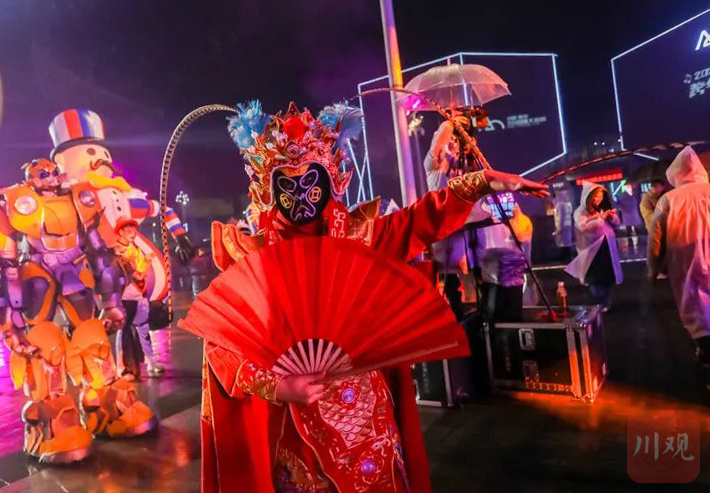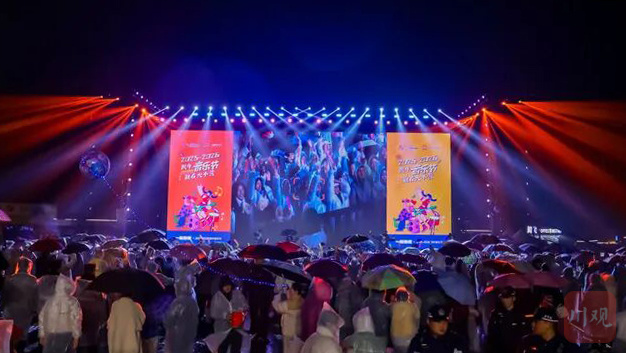 6小时狂欢、机车炸场、零点彩带雨……下午6时许,活动在炫酷的特技演出中拉开序幕,《蓝莲花》、《离开地球表面》……一首首民谣、摇滚、流行乐曲及本土方言rap,在现场乐队的演奏下依次上演,尽管天空下着蒙蒙冬雨,现场观众热情挥舞的荧光棒依旧汇成了“星河”。