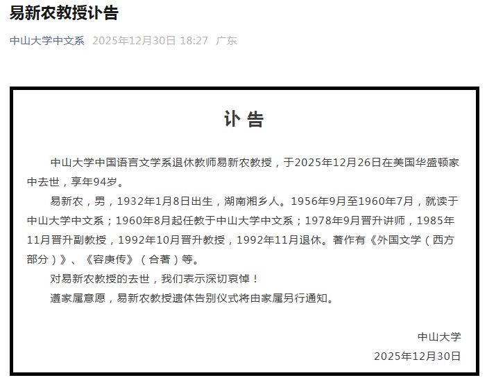 南都N视频记者从易新农教授家属处获悉,著名外国文学研究专家、中山大学中国语言文学系易新农教授12月26日逝世,享年94岁。