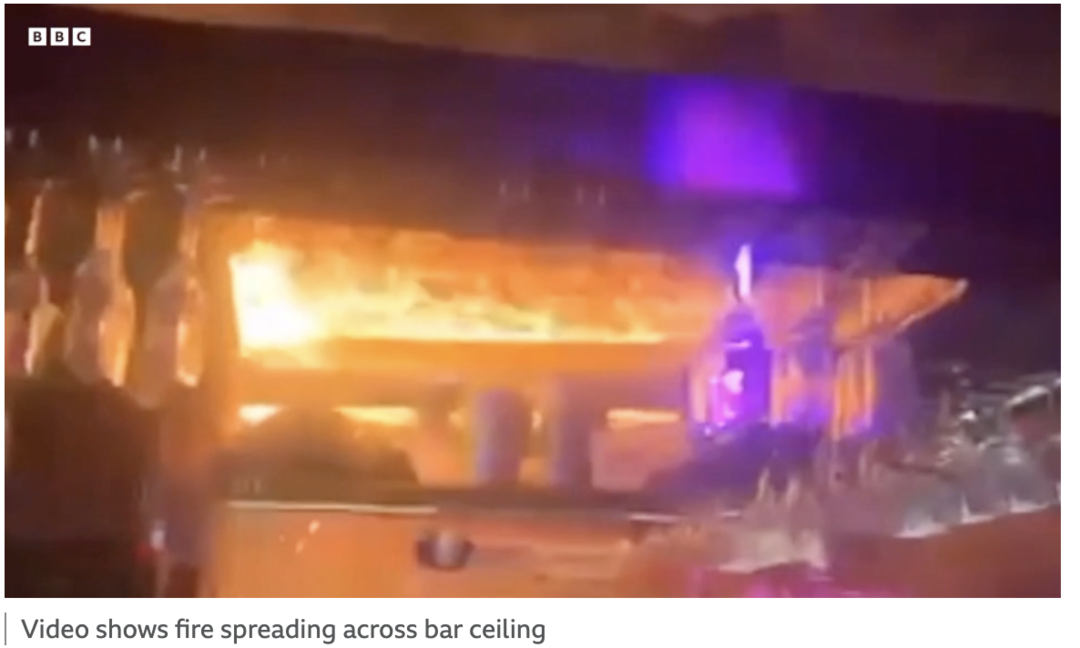 BBC也发布了一则酒吧内天花板起火的视频。视频中,酒吧内正播放音乐,天花板处有明火正在剧烈燃烧。