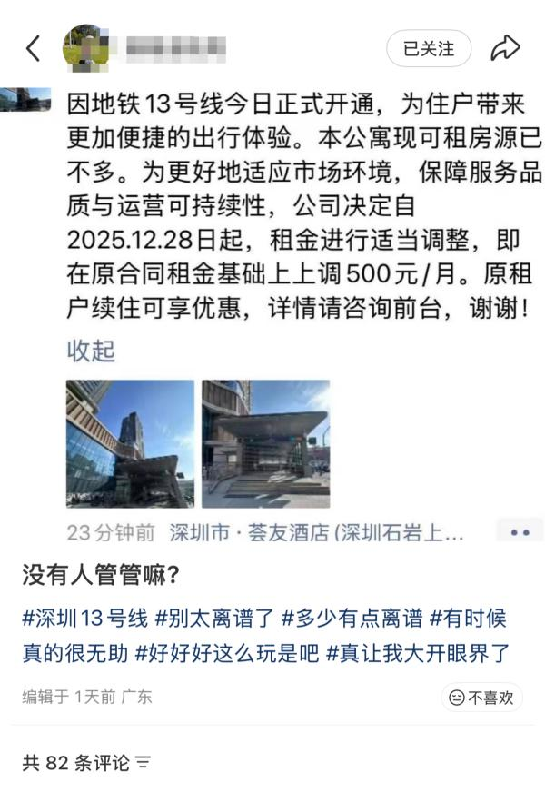 近日,有网友反映,位于宝安石岩上屋片区的多家公寓在地铁13号线开通后,计划上调房租。对此,记者实地走访并采访了公寓方、周边房东、中介及在租租客。