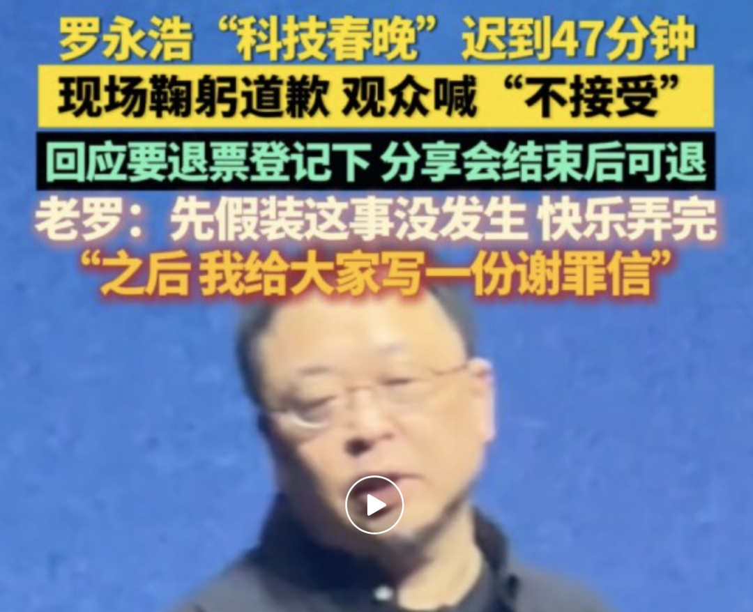 12月30日晚,罗永浩2025年度科技创新分享大会在上海举行。根据预告,大会将于19时进行,不过,罗永浩本人并未准时现身,而是迟到了40多分钟后才出现在讲台。
