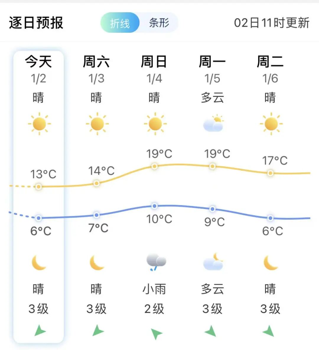 伴随着冷空气到来,今起气温明显下降,过程最低气温将出现在3日夜晨,城区最低气温降至2℃~6℃,大部分县市可能出现霜或霜冻,高海拔乡镇可能会有结冰。气温低,体感寒冷,请及时添衣保暖,谨防感冒。