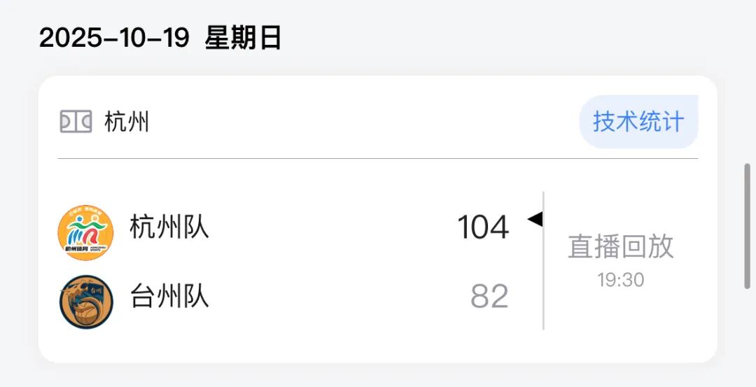 本场比赛后,台州队的战绩为12胜7负积31分,杭州队的战绩为17胜2负积36分。比赛精彩瞬间↓