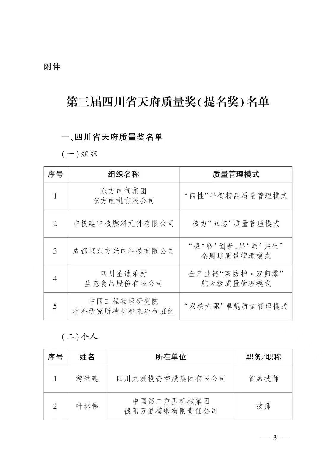 2025年12月31日,在第三届四川省天府质量奖(提名奖)公布的名单中,绵阳市共有2个组织和1名个人获得表彰,以正奖数量位居全省首位的成绩在四川省质量领域的最高荣誉榜单中,再度镌刻上鲜明的“绵阳印记”。