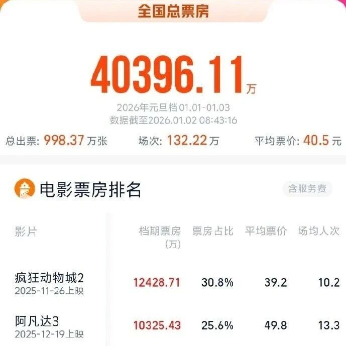 据网络平台数据,截至1月2日14时58分,2026年元旦档档期(1月1日—1月3日)总票房破5亿。