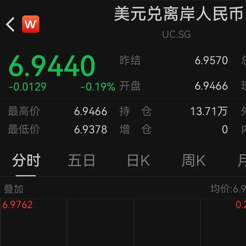 今日,离岸人民币兑美元升破6.97,最高升至6.9678,创2023年5月以来新高。