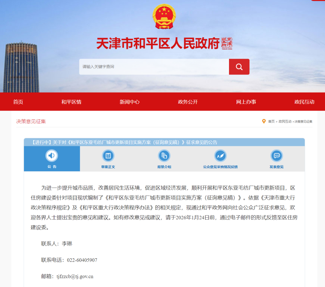 近日,天津市和平区发布“关于对《和平区东亚毛纺厂城市更新项目实施方案(征询意见稿)》征求意见的公告”,城市更新范围、改造项目、实施计划等披露。