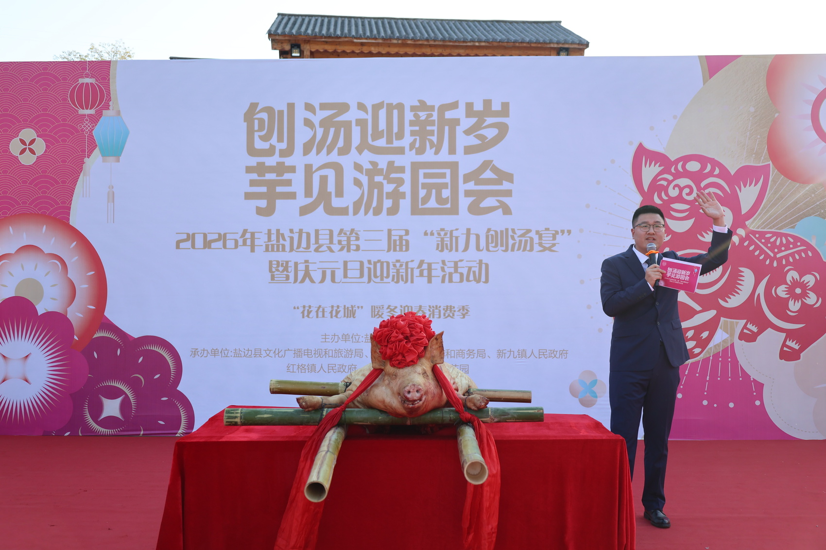 2026年1月1日,攀枝花市盐边县“芋见·张宜花园”内人声鼎沸、肉香四溢,第三届“新九刨汤宴”暨“刨汤迎新岁·芋见游园会”热闹举行,市民游客在热气蒸腾的“刨汤宴”和民俗体验中,共同迎接新的一年。
