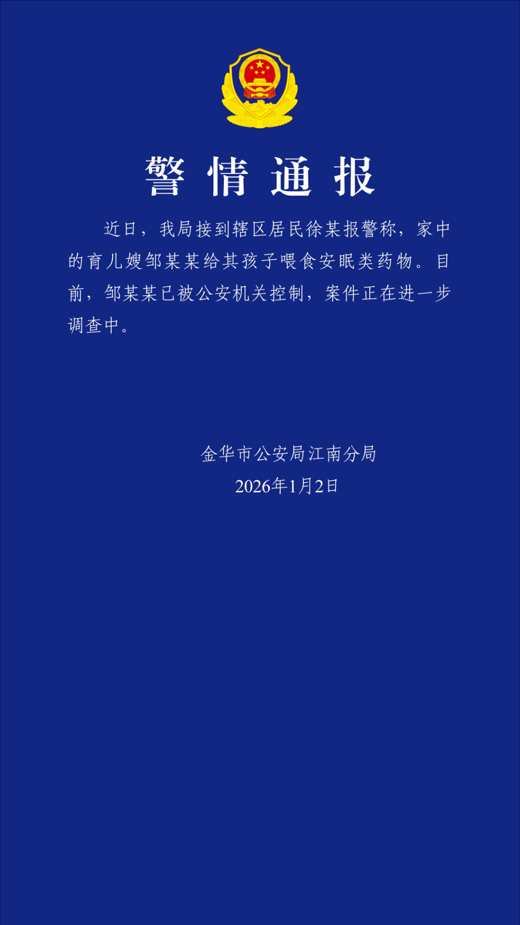 2026年1月2日,浙江省金华市公安局江南分局发布警情通报: