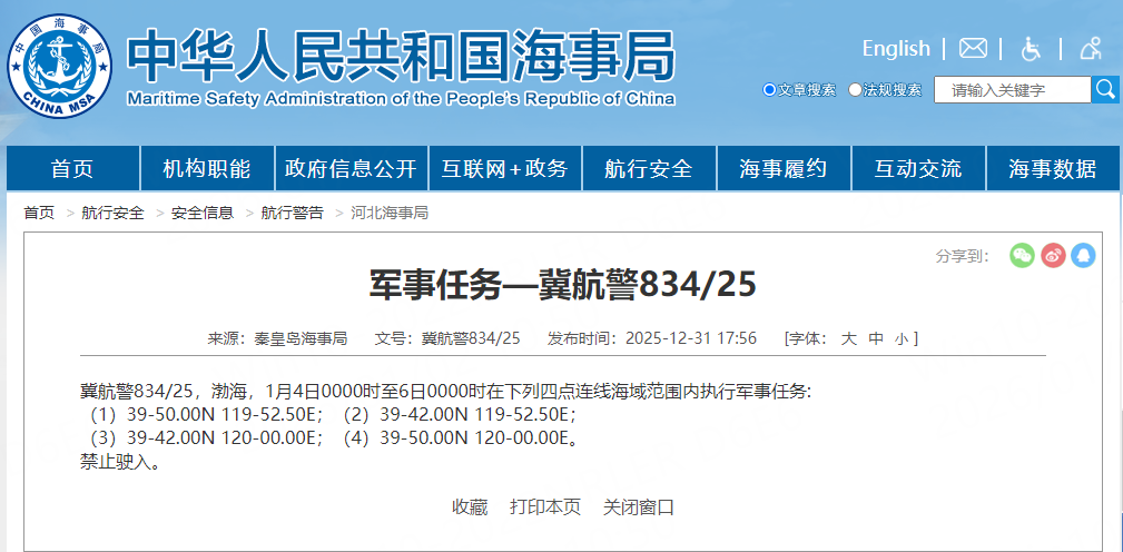 据中国海事局网站消息,秦皇岛海事局发布航行警告,1月4日0时至6日0时,渤海部分海域执行军事任务,禁止驶入。