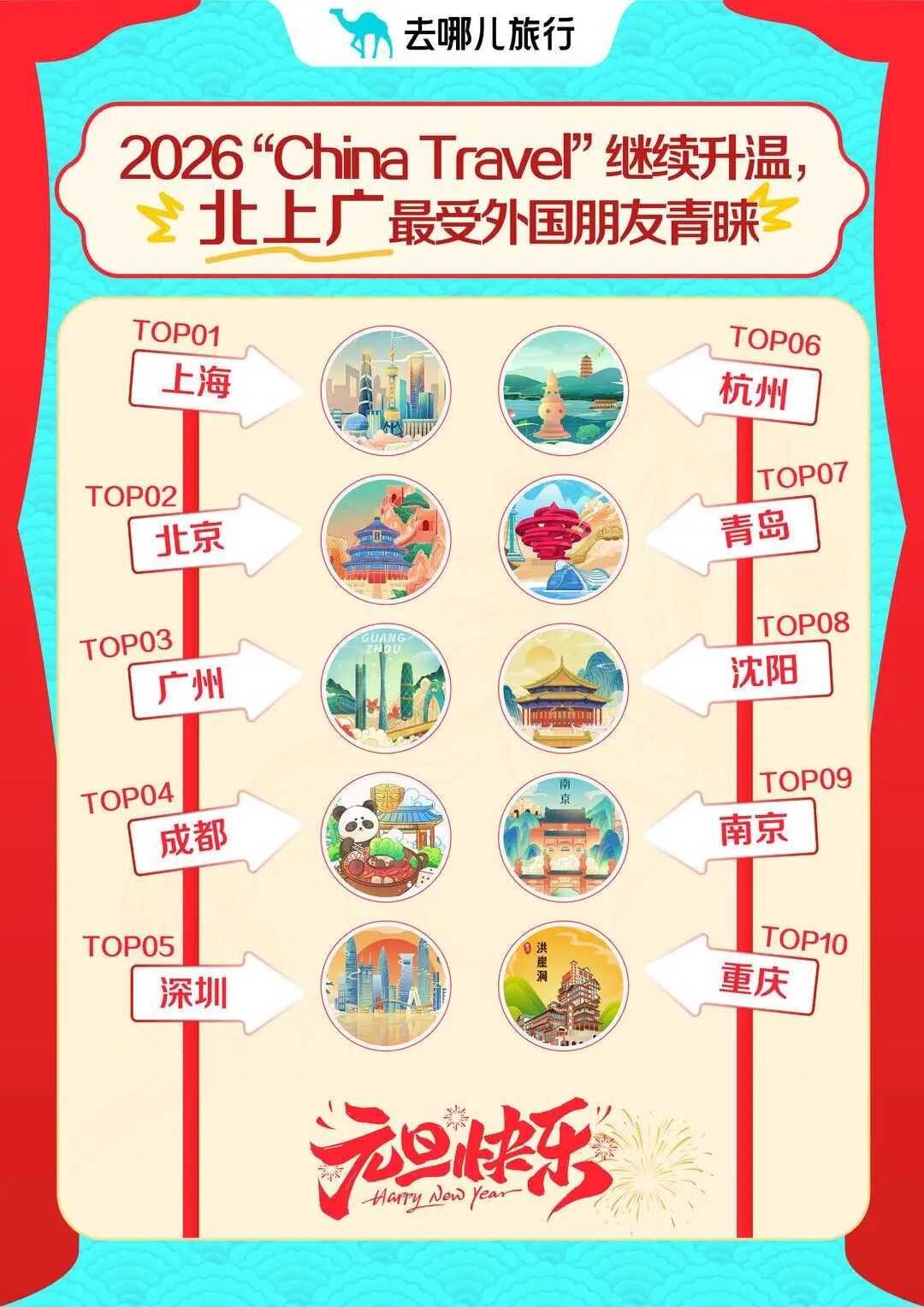 据去哪儿旅行平台大数据显示,今年1月1日全国入境游机票预订量较去年同期增长20%。在入境目的地热门城市榜单上,沈阳位列全国第八,成为东北地区唯一跻身TOP10的城市,与上海、北京、广州、成都等一线及新一线城市共同组成最具吸引力的入境旅游目的地矩阵。