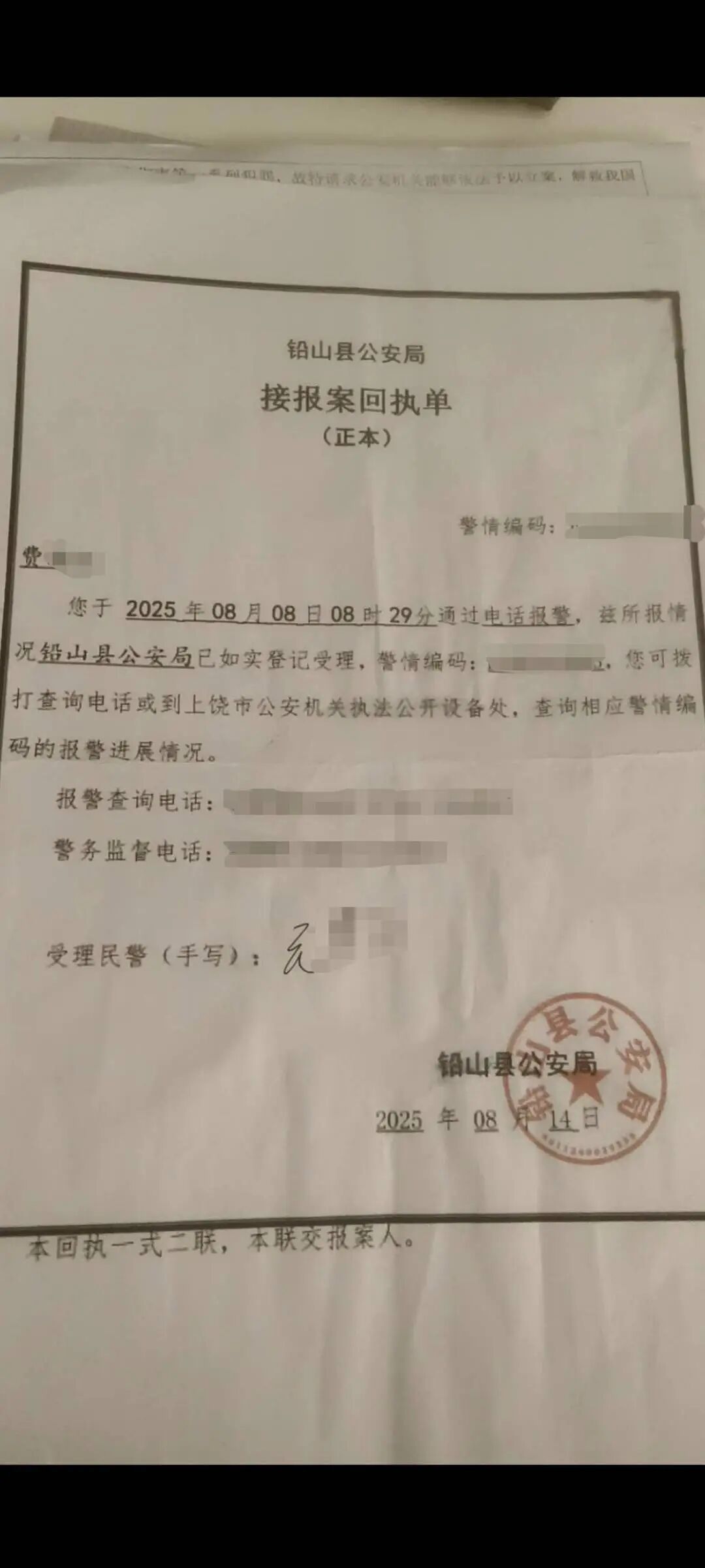 铅山县公安局出具的报警回执单