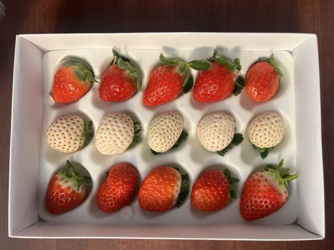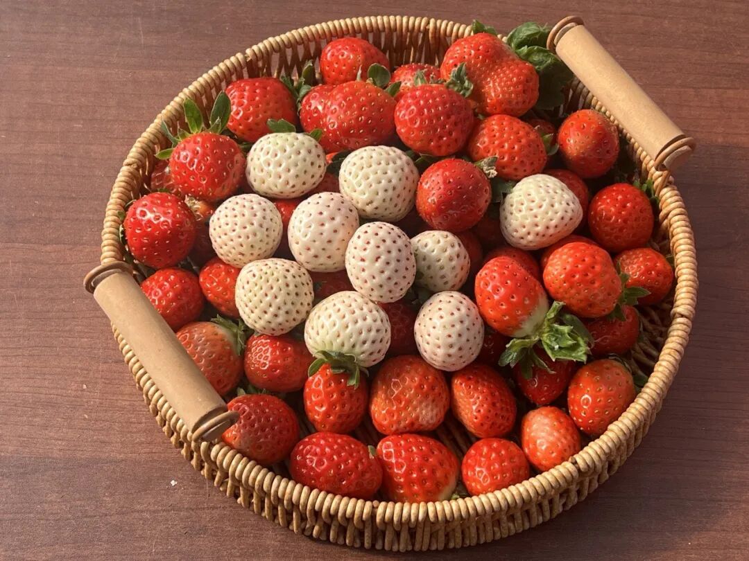 钟国群教了一套选草莓的小技巧:红草莓要摘8分熟的,留下20%的白色,口感最佳;白草莓则要等到9分熟,果子由青色全转成白色,风味才达到顶峰,“10分熟的草莓口感就过了,可能伴有发酵味,反而不好吃。”
