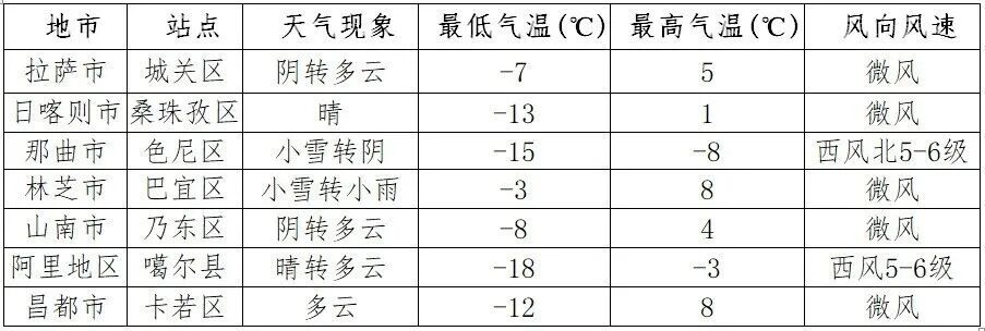 72小时趋势预报:林芝和山南南部多云间阴天,部分地方有阵雪(雨);其他地方少云间多云。阿里、那曲、日喀则西部和南部有7级左右大风。