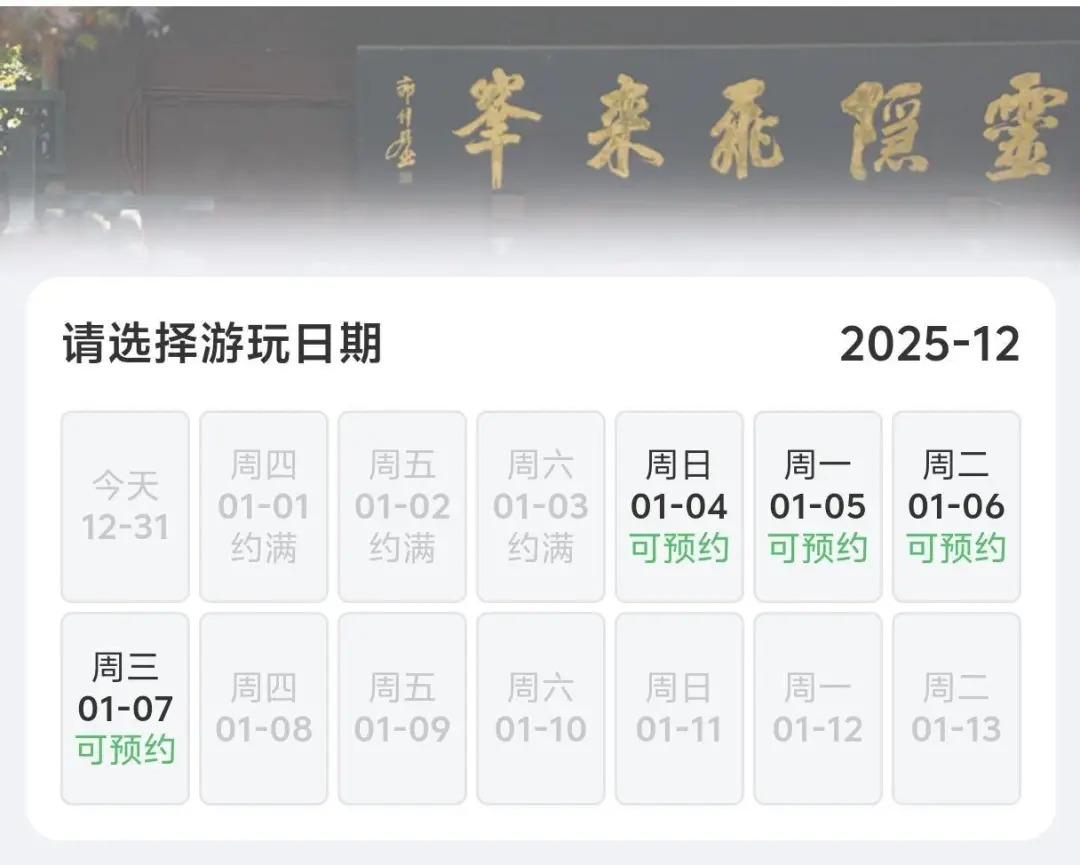 据浙江在线1月1日消息,“杭州灵隐飞来峰”小程序显示,元旦假期三天均已显示约满。