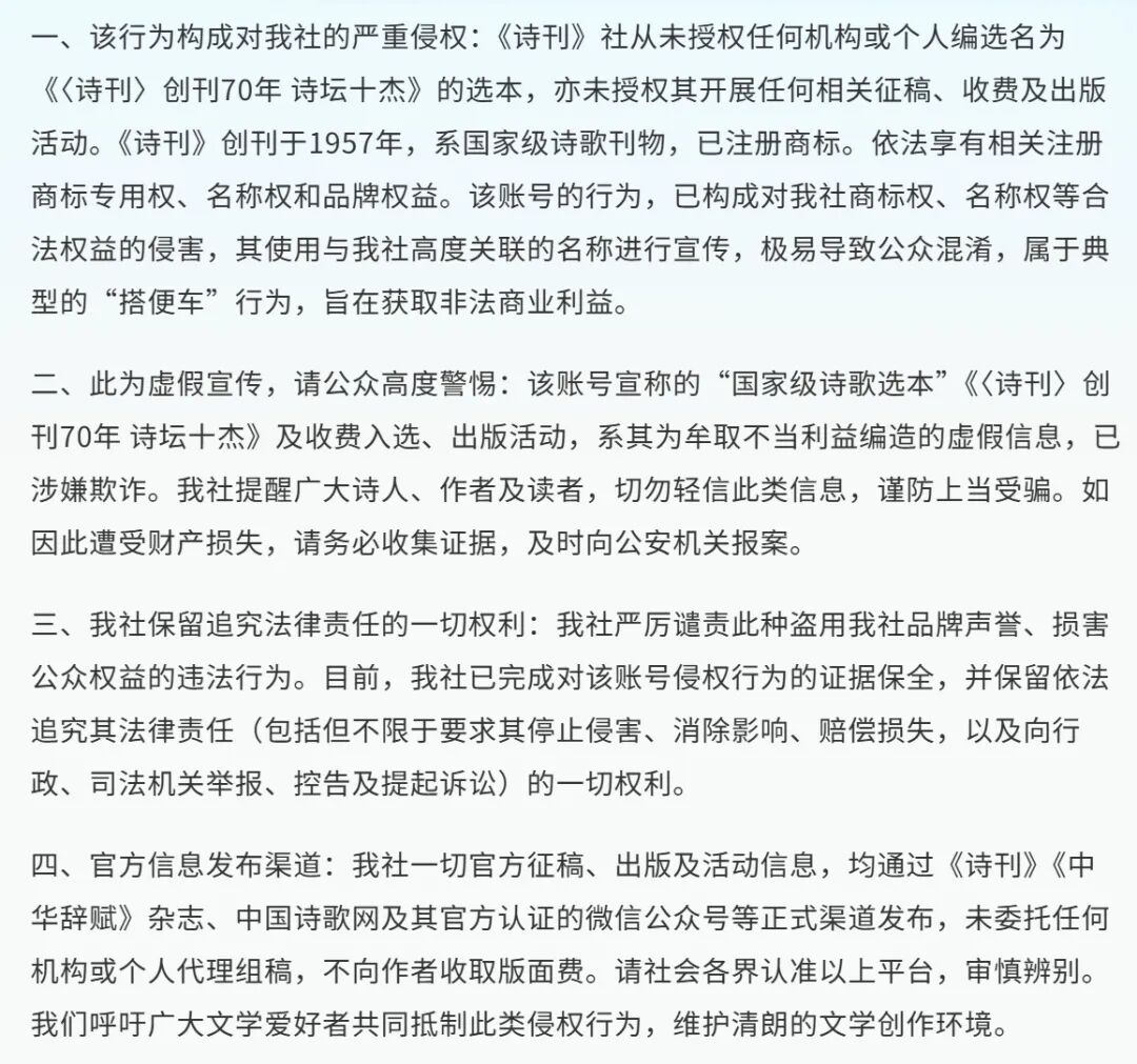 2026年1月2日下午,《诗刊》社通过官方微信公众号发布《严正声明》:近日,我社发现,有名为“传世图书策划出版中心”的微信公众号以编辑出版“国家级诗歌选本”《〈诗刊〉创刊70年 诗坛十杰》为名,向社会公开征稿并收取高额费用。该行为严重侵权,并涉嫌欺诈。我社郑重声明如下: