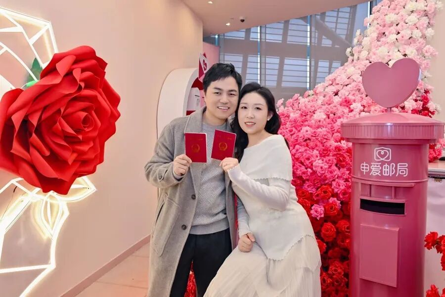 走进申爱邮局,温馨粉色调的空间内,专为新人设计的“心动留声墙”可录制爱情誓言,“书礼寄存站”能投递给未来的信函或纪念礼品,专属定制的粉色爱心邮筒承载着即时传递的甜蜜。陈飞鸢和郭萍是当天登记的一对95后新人,恋爱期间他们就彼此写过情书,“以后的日子里,如果遇到怦然心动的瞬间,我们还是会像以前一样,把爱意说给对方听。”