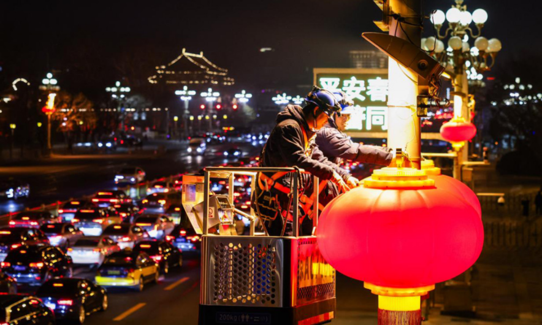 2025年1月24日,农历腊月二十五,华灯照明保障进入关键阶段。国网北京电力城市照明管理中心华灯班的员工们趁着夜深车少,登上高空作业车,在严寒中对天安门广场和长安街上的大红灯笼逐一进行调试,仔细检查线路与光源,确保每一盏灯明亮如新、稳定运行。从单灯监测系统的优化,到日常特巡特护,他们用细致的付出,点亮节日里的祥和与团圆。
