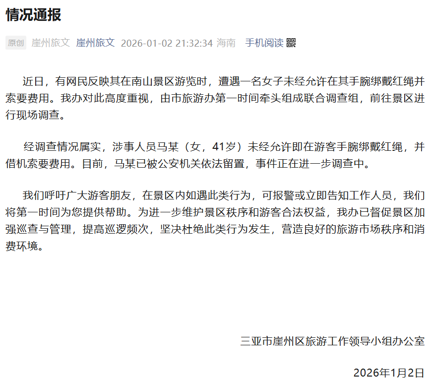经调查情况属实,涉事人员马某(女,41岁)未经允许即在游客手腕绑戴红绳,并借机索要费用。目前,马某已被公安机关依法留置,事件正在进一步调查中。