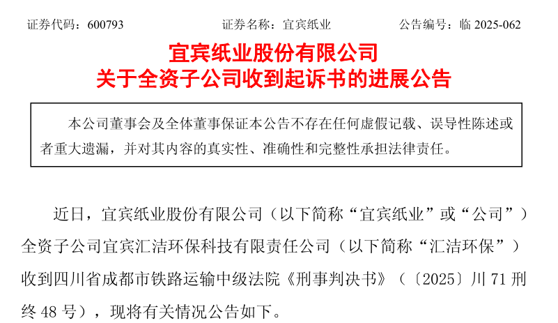 12月30日,宜宾纸业发布全资子公司涉诉进展公告,其全资子公司宜宾汇洁环保科技有限责任公司(简称“汇洁环保”)近日收到刑事判决书,法院维持判决,判定汇洁环保犯污染环境罪,判处罚金10万元。