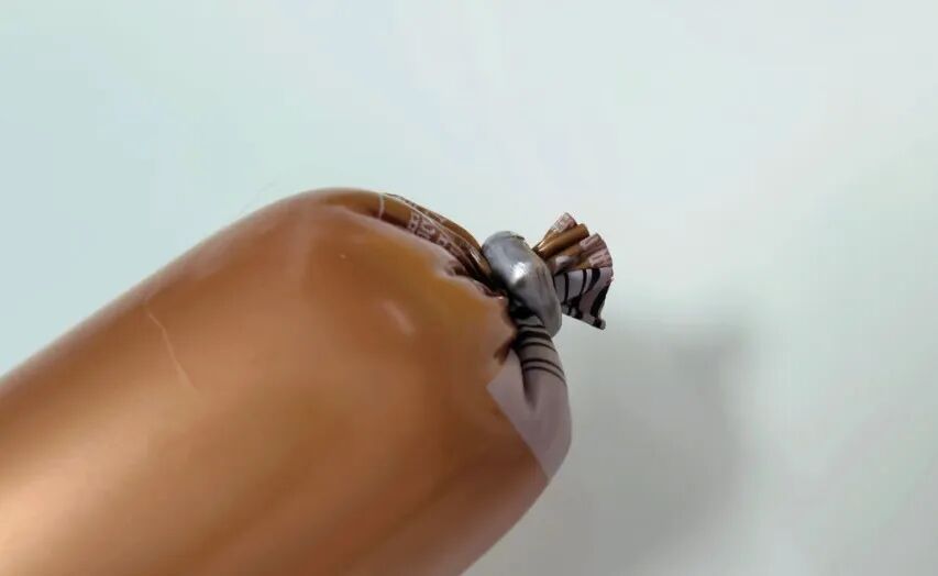 而铝环是最合适的封口工具,一般是用填充结扎机,利用金属铝良好的延展性和可塑性,在机械臂的强力挤压下,将铝丝瞬间冲压成一个紧密的环扣,死死勒住肠衣的两端。在密封的同时肠衣也被挤压到了极限,内部几乎没有空气,可有效阻止氧气和细菌进入。