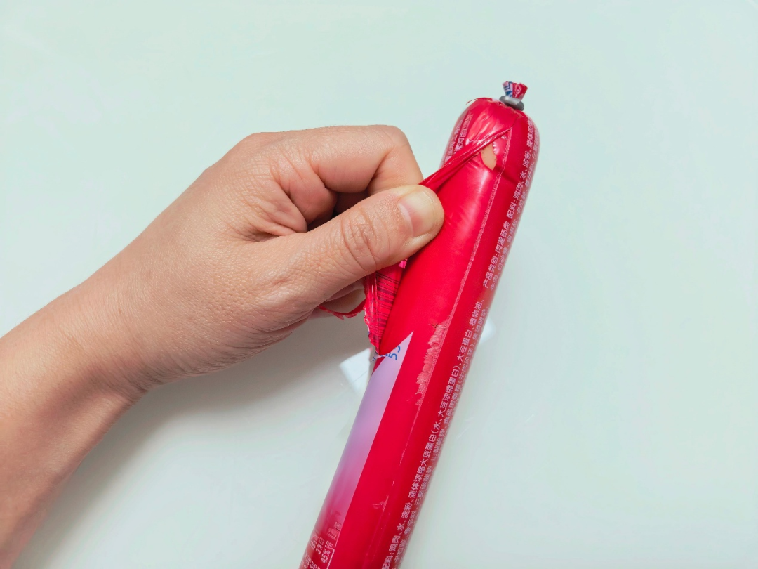 双手握住火腿肠直接掰,这时中间部位的肠衣膜会变薄,找个锋利的东西一戳便会“啪”地一声自动断掉。