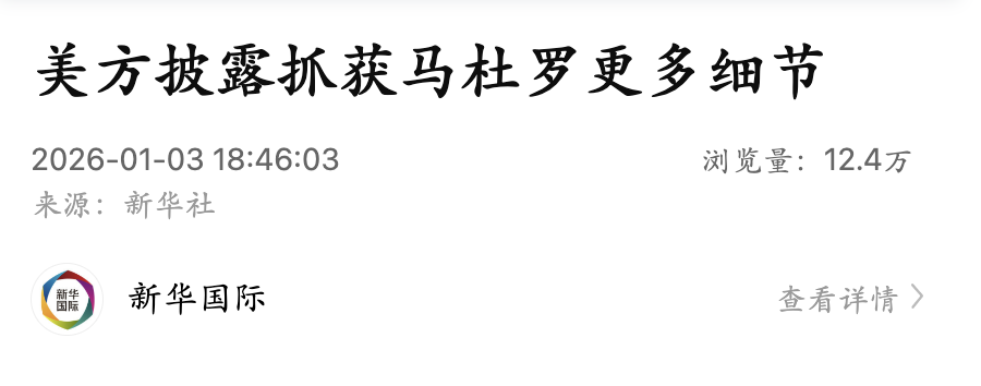 新华社华盛顿1月3日电 美国总统特朗普3日宣布,美国在对委内瑞拉的行动中抓获委总统马杜罗及其夫人,并将他们带离委内瑞拉。美国媒体随后披露了此次行动的更多细节。