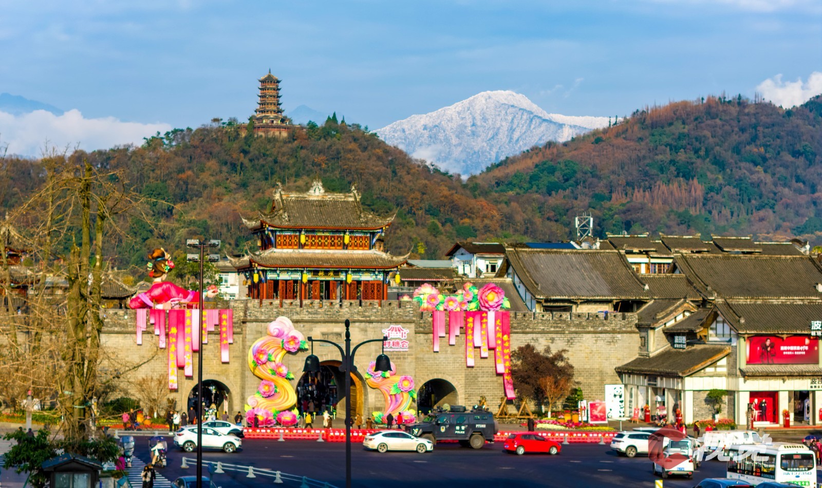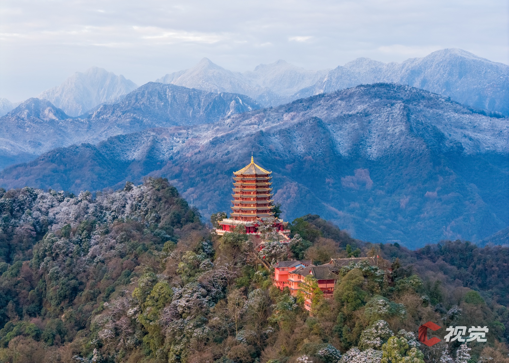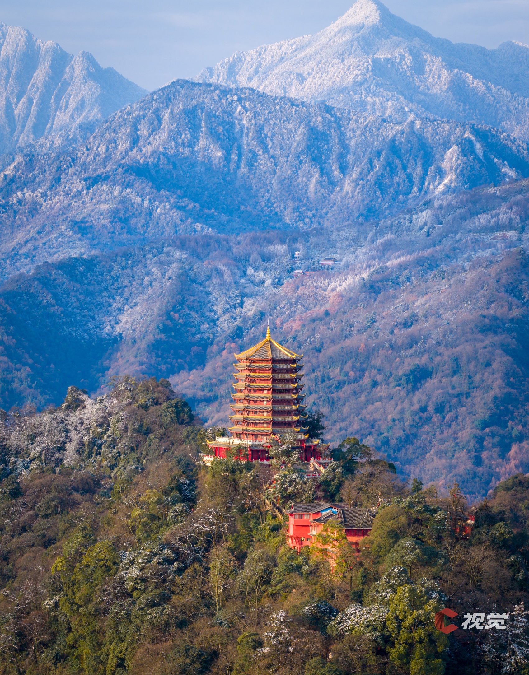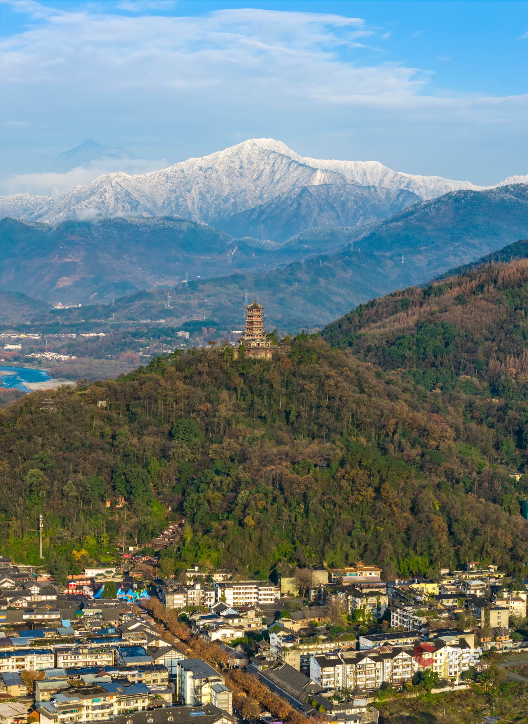 1月4日,都江堰玉垒阁与雪山同框。C视觉签约摄影师 陈先林