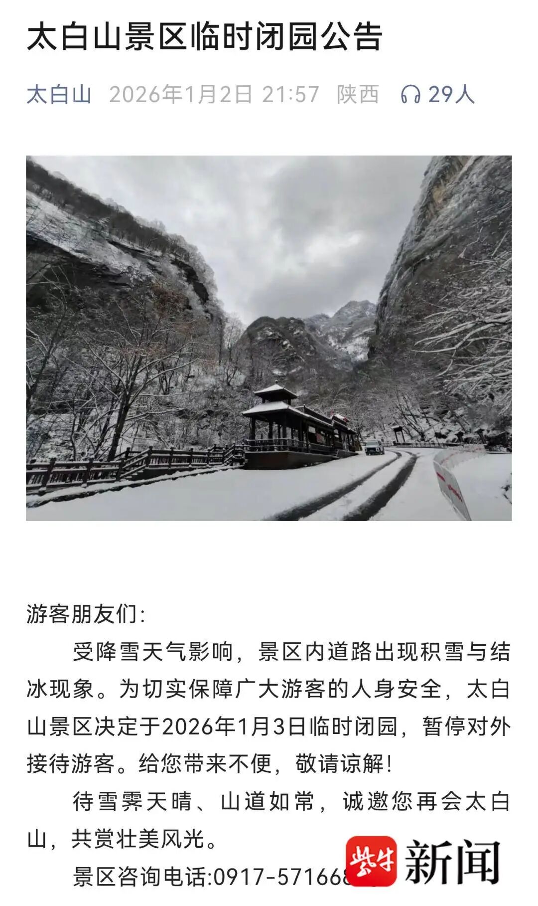 2026年1月2日,陕西太白山景区因持续低温天气引发路面积雪、结冰,部分游客在游览过程中遭遇滞留情况,相关视频及消息在社交平台引发广泛关注。