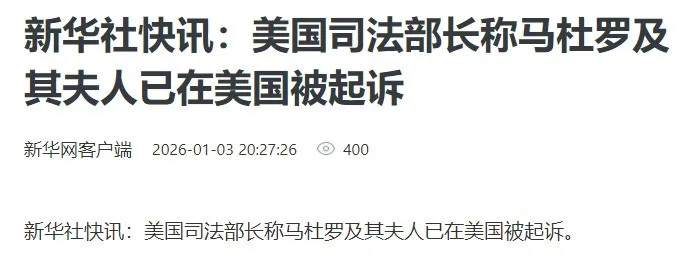 据新华社消息,美国司法部长称马杜罗及其夫人已在纽约被起诉。