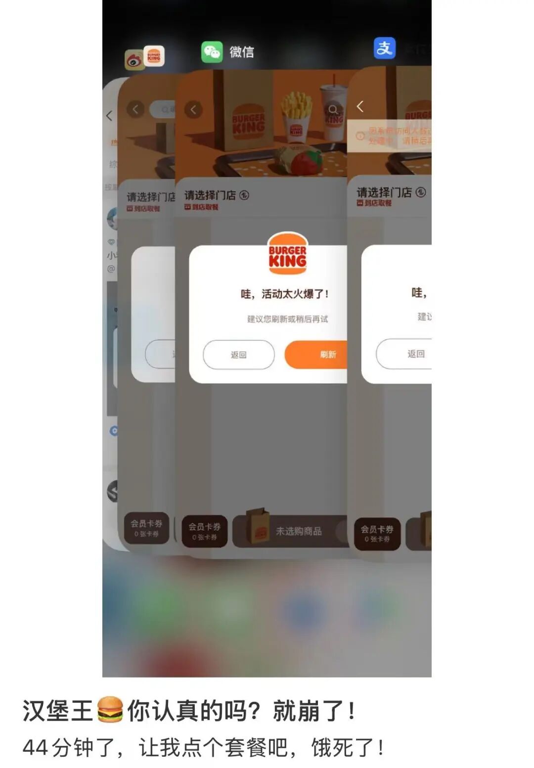 1月4日上午,因代言人田栩宁的元旦礼盒上线,大量粉丝涌入导致汉堡王小程序和APP短时间内崩溃,用户无法访问或下单,截至11时55分,点餐系统仍未恢复。